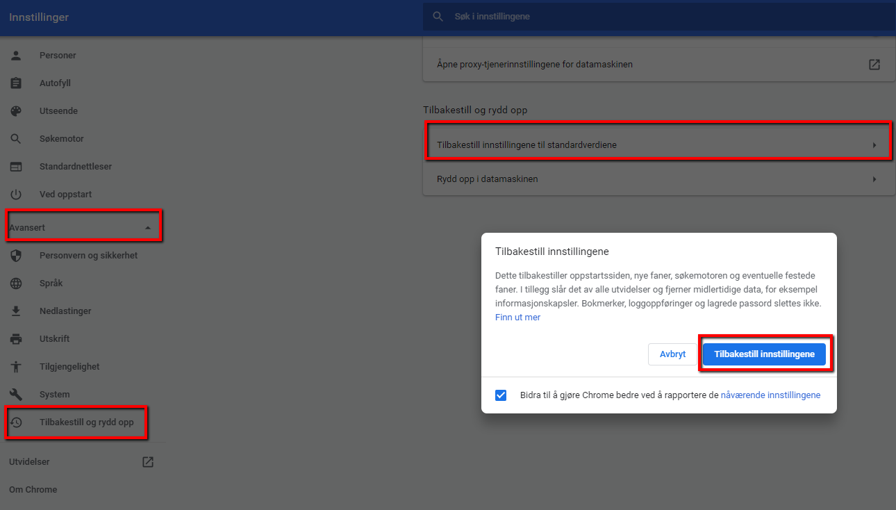 (Innstillinger, Avansert, Tilbakestill og rydd opp, Tilbakestill innstillingene til standardverdier, Tilbakestill innstillingene)
